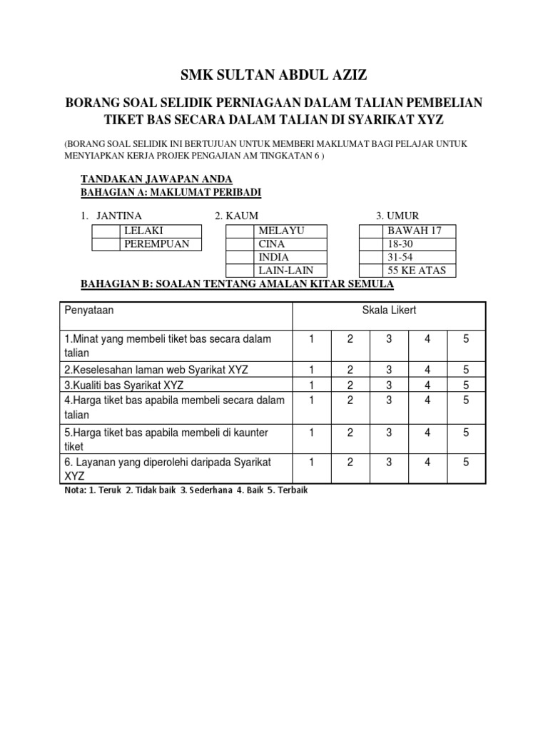 CONTOH BORANG-SOAL-SELIDIK from imgv2-2-f.scribdassets.com Exclaim, inquiry, question, research, atm survey, questionnaire, feedback form. Soal selidiksoal selidik merupakan satu set soalan atau item dalam bentuk tulisan. Soal selidik latihan industri oleh penyelia organisasi. Another word for opposite of meaning of rhymes with sentences with find word forms translate from english translate to english words with friends scrabble crossword / codeword words starting with words ending with words containing exactly. Subskala utama iaitu subskala ibu bapa kritikal, subskala ibu bapa pengasih, subskala. Check 'soal selidik' translations into english. Find a translation for soal selidik kepuasan pelanggan in other languages english (english). If you want to learn soal selidik in english, you will find the translation here, along with other translations from malay to english.