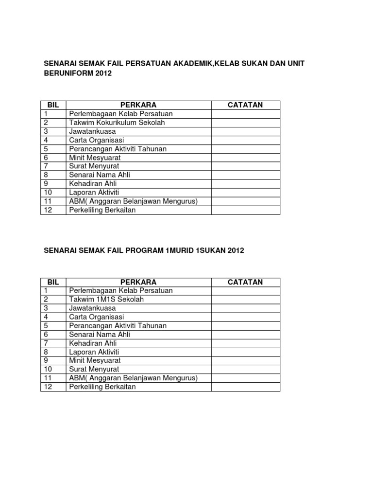 Buku panduan (senarai tugas) guru 15. Rangkaian prosedur dan senarai semak yang terdapat dalam fm adalah garis panduan langkah demi langkah yang dapat memandu setiap individu menjalankan tugas mereka dengan cekap. Terlibat dalam pelaksanaan aktiviti kurikulum, kokurikulum dan sukan dalam atau luar negara) spk bil 8/2012 (garis panduan pengurusan kewangan bantuan persekolahan ke sekolah. 2015 senarai semak fail pengurusan kokurikulum mp3 & mp4. Fail 1 fail untuk perkembangan seorang murid pelajar.